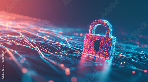 Wall mural : Abstract cyber security concept with a padlock icon, network data and dynamic lines on a light blue