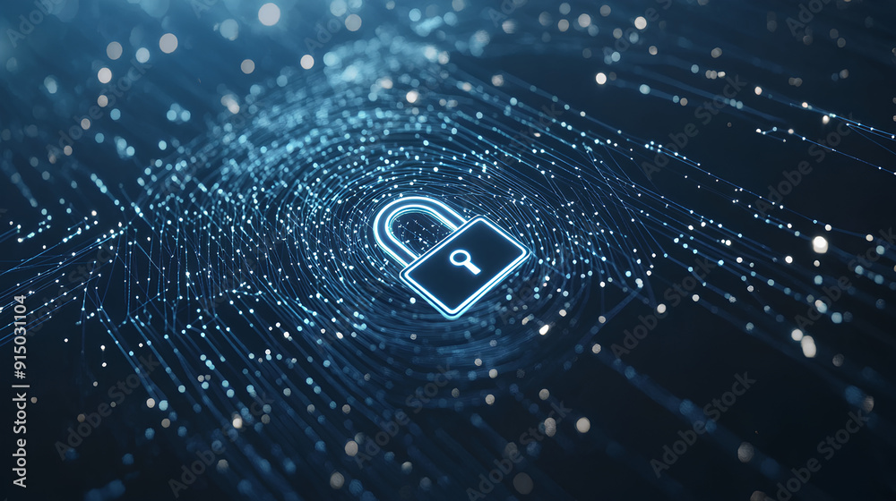Wall mural : Abstract cyber security concept with a padlock icon, network data and dynamic lines on a light blue