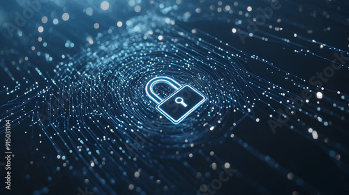 Wall mural abstract cyber security concept with a padlock icon, network data and dynamic lines on a light blue