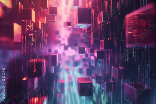 Wall mural abstract cyber tech background with floating 3d holographic cubes, emitting pulses of light in a dig