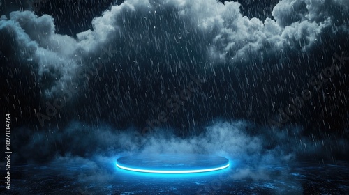 The watermark will not be included on Wall mural.: Abstract dark background with illuminated round blue platform in the center, empty space around, bla