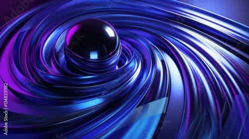 Wall mural abstract dark black gloss round background with metallic blue and purple curves, spirals and shiny b