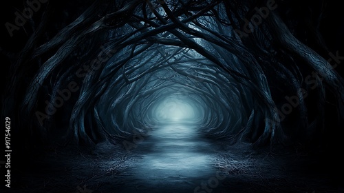 The watermark will not be included on Wall mural.: Abstract dark forest scene with swirling shadows and ghostly figures, a twisted pathway leading into