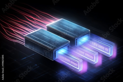 Wall mural abstract data flow: glowing rectangles with fiber optic cables on dark grid. - Wall murals Wall mural abstract data flow: glowing rectangles with fiber optic cables on dark grid. - Wall murals