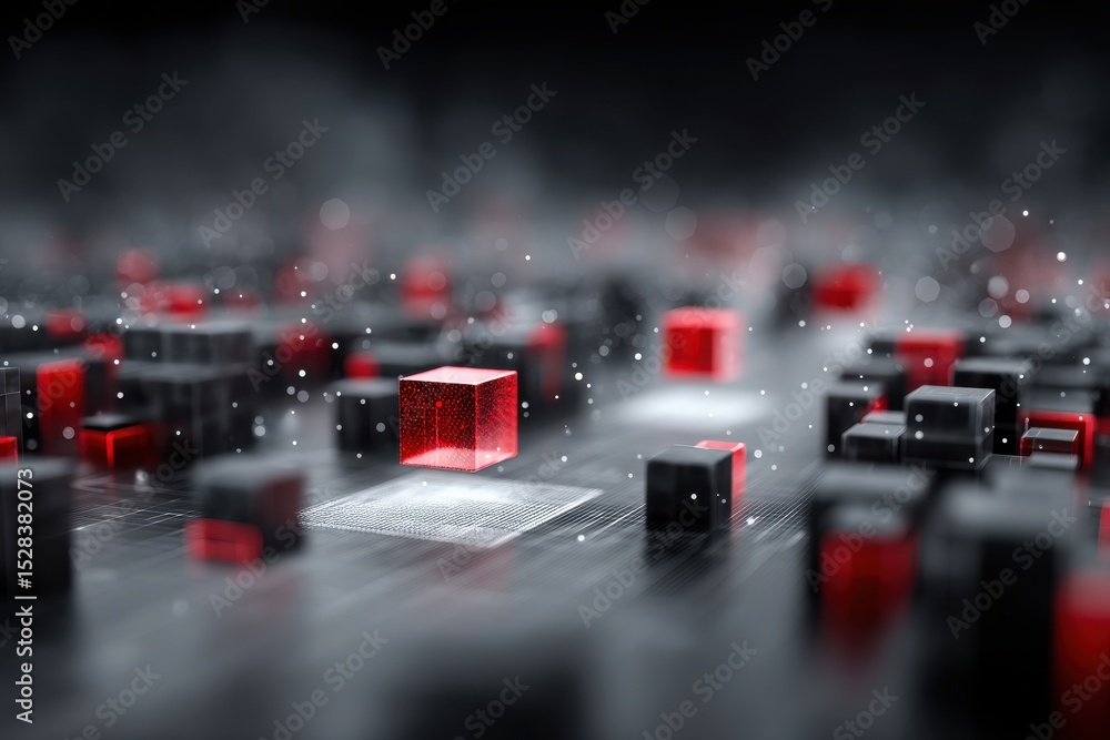 The watermark will not be included on Wall mural.: Abstract depiction of data grid with glowing cubes in black and red tones