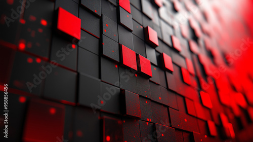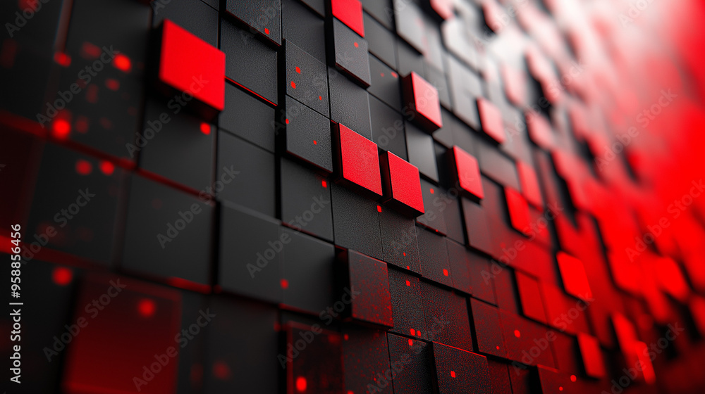 The watermark will not be included on Wall mural.: Abstract design of red and black cubes creating a textured wall in a modern artistic environment