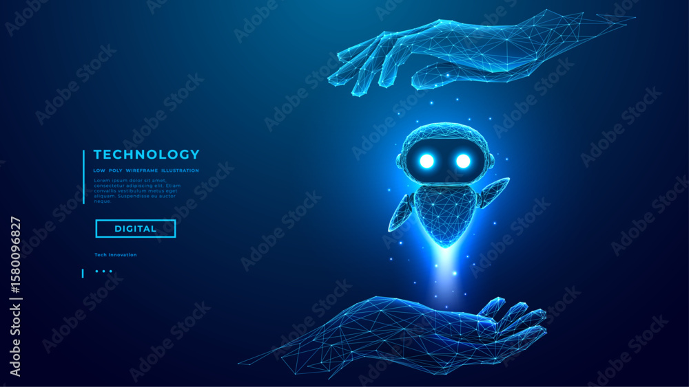 Wall mural abstract digital ai robot into palms. ai agent are flying of a hand. artificial intelligence concept