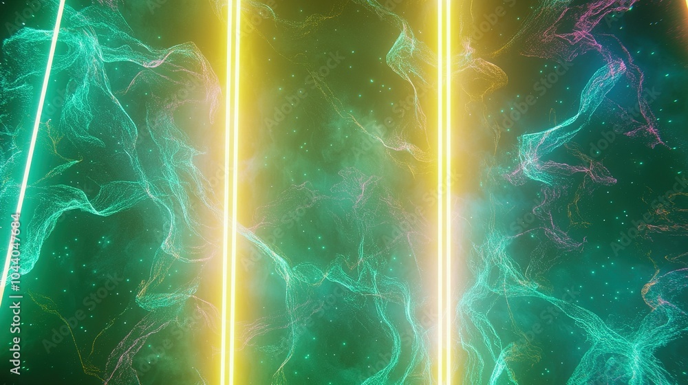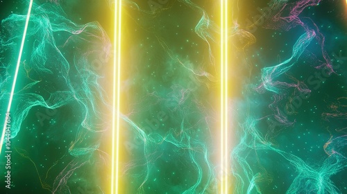 The watermark will not be included on Wall mural.: Abstract digital art featuring colorful light streaks and flowing patterns against a cosmic backgrou
