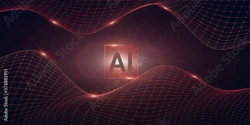 Wall mural : Abstract digital background with ai logo and wave mesh over hexagon cells