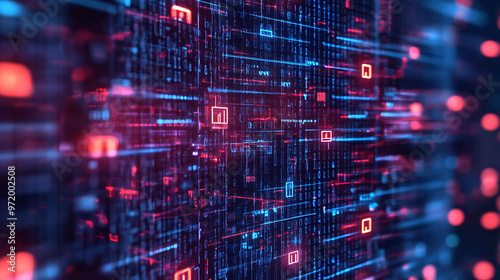 Wall mural abstract digital background with binary code and glowing lines in red and blue. - Wall murals Wall mural abstract digital background with binary code and glowing lines in red and blue. - Wall murals