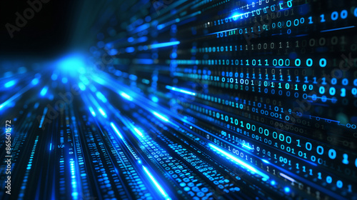 Wall mural : Abstract digital background with blue binary code and light streaks on black, representing data flow