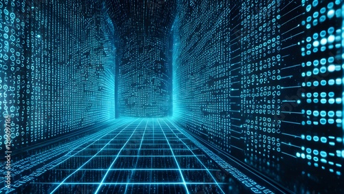 Wall mural : Abstract digital background with glowing blue data streams forming a futuristic corridor -