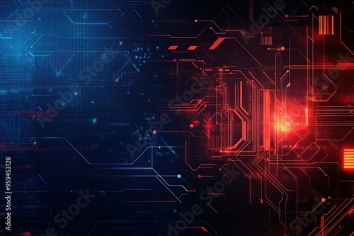 Wall mural : Abstract digital background with glowing circuit patterns in blue and red, representing technology a