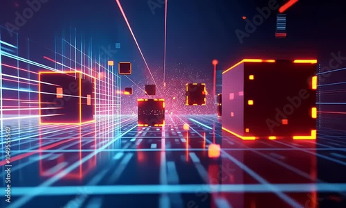 Wall mural abstract digital background with glowing data streams and floating cubes, representing the future of