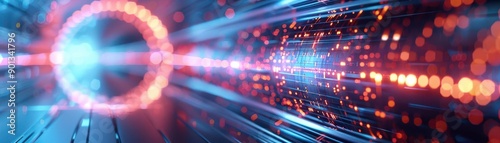 Wall mural : Abstract digital background with glowing light streaks and a circular pattern -