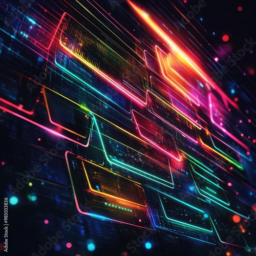 The watermark will not be included on Wall mural.: Abstract digital background with glowing neon lines and rectangles -