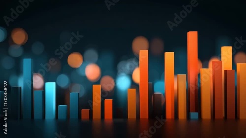 Wall mural : Abstract digital bar chart data visualization with glowing orange and blue vertical bars, vibrant co
