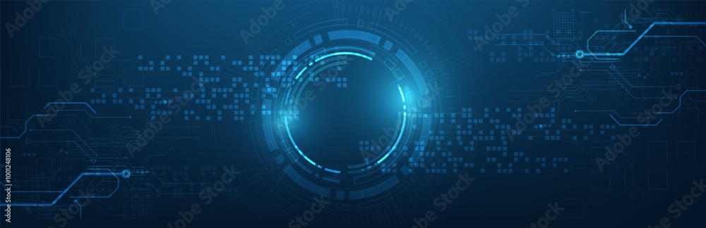 Wall mural : Abstract digital blue background with a glowing circular interface and circuit patterns, symbolizing