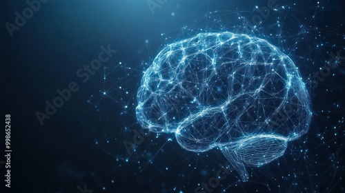 Abstract digital brain made of glowing lines and dots on a dark blue background - Wall mural