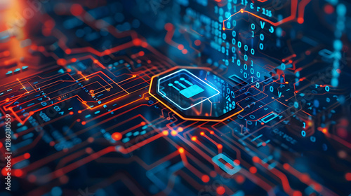 The watermark will not be included on Wall mural.: Abstract digital circuit board with glowing lines and a central processor, showcasing technology