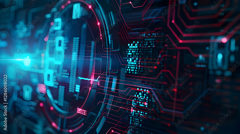 The watermark will not be included on Wall mural.: Abstract digital circuit design with glowing lines and patterns, showcasing technology and innovatio