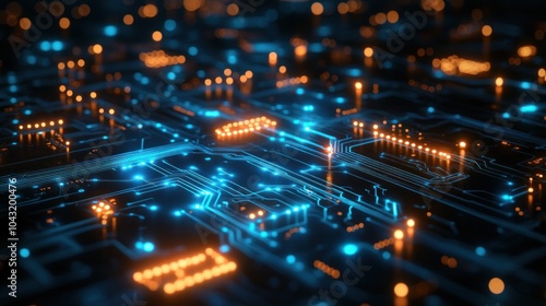 Wall mural : Abstract digital circuit patterns glowing in blue and green, floating over a sleek black background