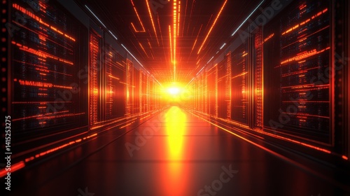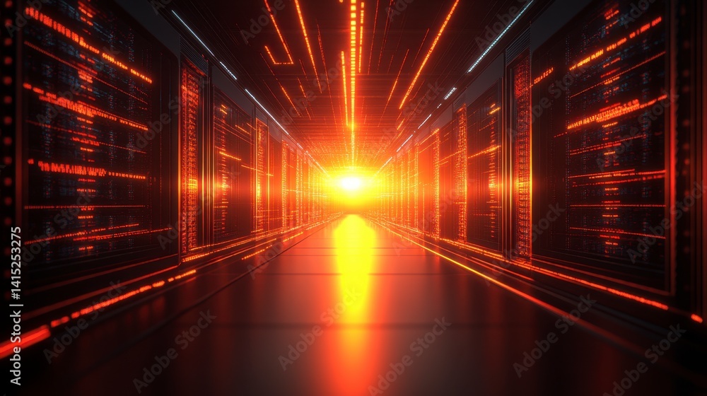 Wall mural : Abstract digital corridor with glowing orange data streams and bright light at the end -