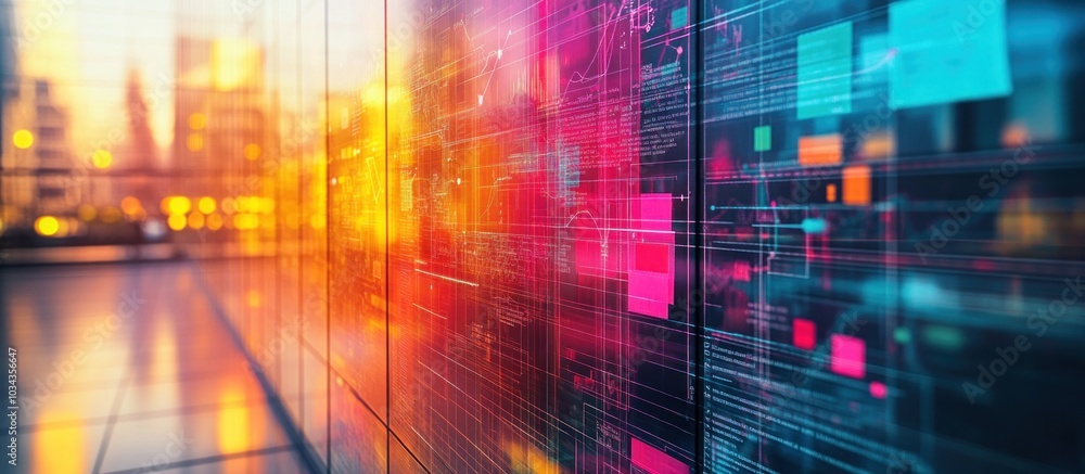 Wall mural abstract digital data and code on a screen with a blurry city skyline background at sunset. - Wall murals Wall mural abstract digital data and code on a screen with a blurry city skyline background at sunset. - Wall murals