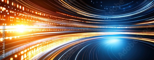 Wall mural abstract digital data stream, glowing lines and binary code in vibrant orange and blue, futuristic t