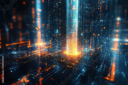 The watermark will not be included on Wall mural.: Abstract digital data streams, glowing lines and particles forming futuristic cityscape -