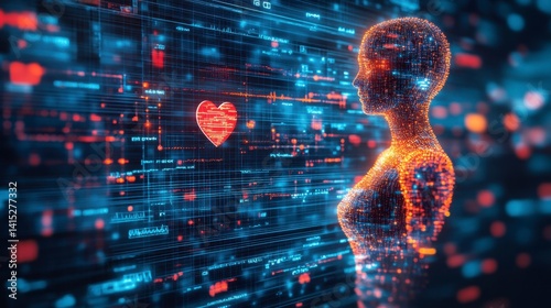 Wall mural abstract digital female figure composed of glowing particles, standing before a background of binary