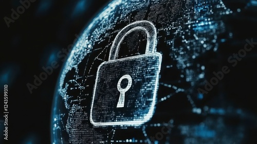 Wall mural : Abstract digital globe with a glowing lock, representing global security and data protection - dark b
