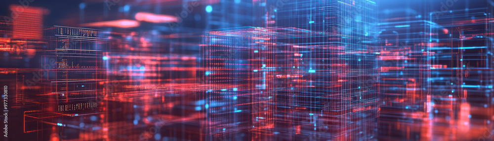 The watermark will not be included on Wall mural.: Abstract digital grid showcasing futuristic technology concept with glowing blue and red lines, repr