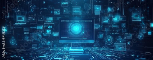 The watermark will not be included on Wall mural.: Abstract digital illustration of a futuristic computer interface with glowing holographic elements
