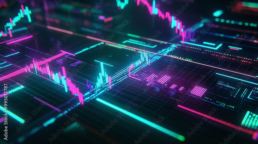 Wall mural : Abstract digital interface with colorful graphs and data visualization elements against a dark backg