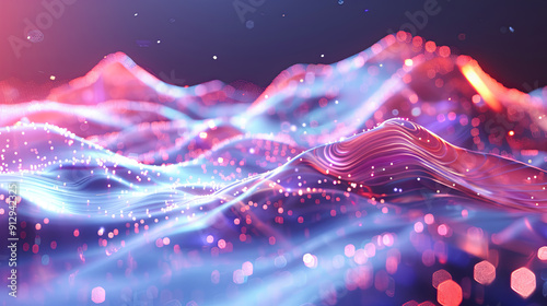 Wall mural : Abstract digital landscape with flowing particles and bokeh effect cyber futuristic background big d