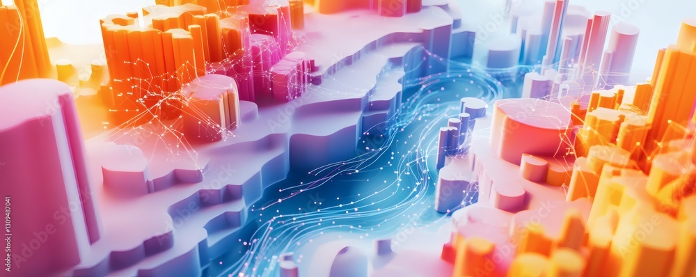 The watermark will not be included on Wall mural.: Abstract digital landscape with flowing pathways and connected networks