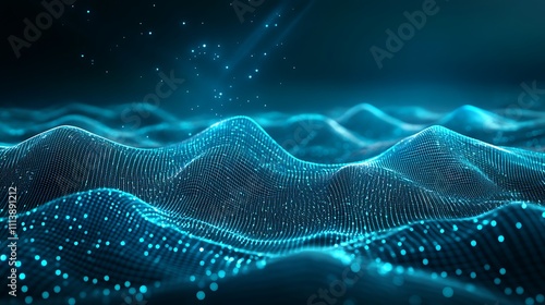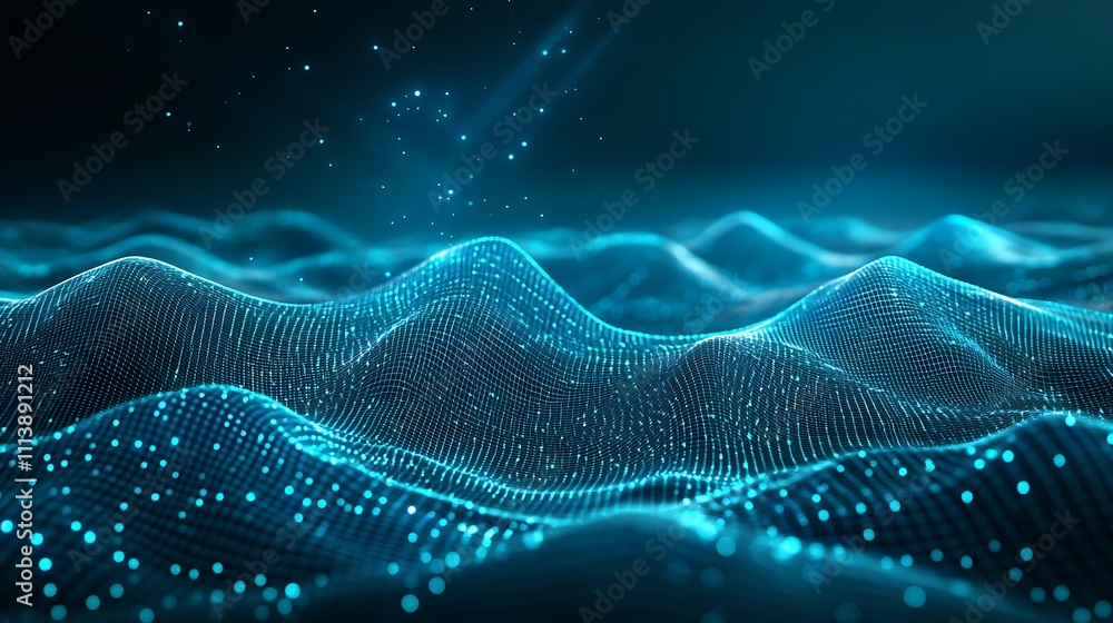 The watermark will not be included on Wall mural.: Abstract digital landscape with flowing waves and sparkling particles in blue and teal color scheme