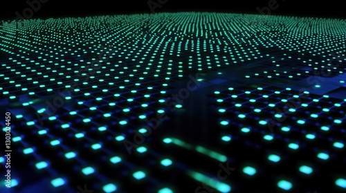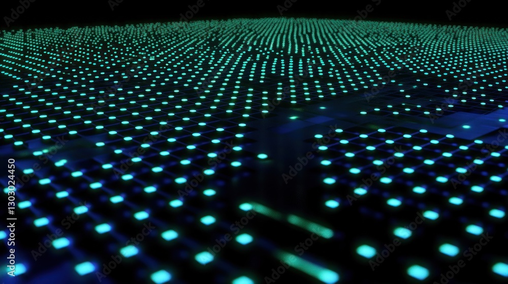 The watermark will not be included on Wall mural.: Abstract digital landscape: a mesmerizing array of glowing teal lights forming a grid-like pattern,