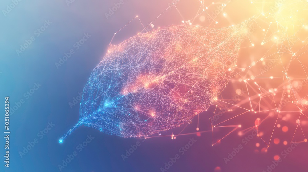 Wall mural abstract digital leaf made of glowing lines and dots on a colorful background.