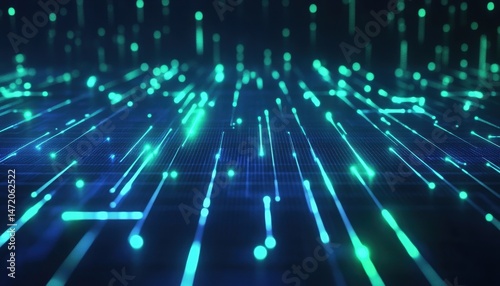 Wall mural abstract digital network background with glowing blue and green lines and particles