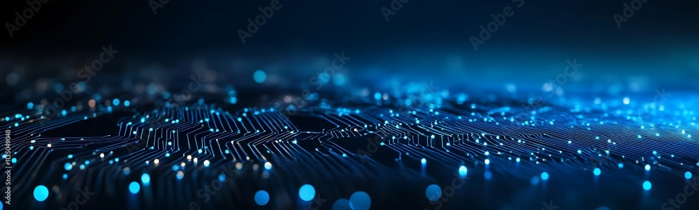 Wall mural : Abstract digital network circuit board background banner with glowing light and connecting data dots