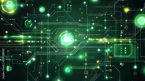 Wall mural : Abstract digital network with green glowing lines and shapes