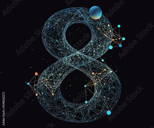 Wall mural abstract digital number eight formed by interconnected blue wireframe lines and nodes with planetary - Wall murals Wall mural abstract digital number eight formed by interconnected blue wireframe lines and nodes with planetary - Wall murals