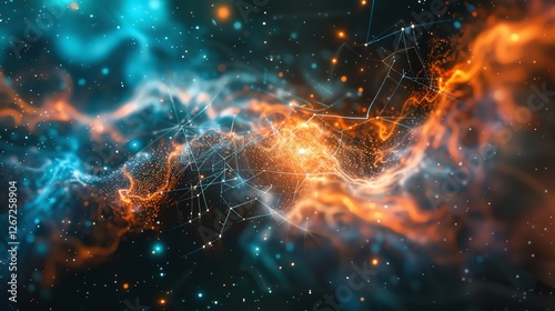 Wall mural abstract digital rendering of a network of lines and dots in blue, orange, and white with glowing li