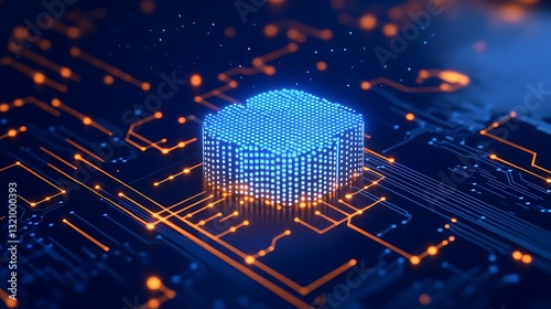 Wall mural : Abstract digital representation of a glowing cube on a futuristic circuit board background with blue