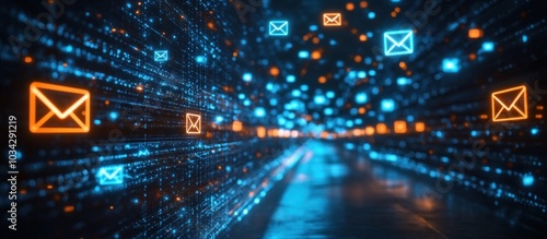 Wall mural abstract digital tunnel with glowing email symbols and data stream.
