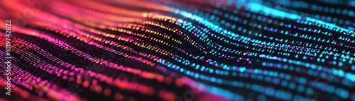 Wall mural : Abstract digital wave pattern with vibrant neon colors and light effects, representing data flow and