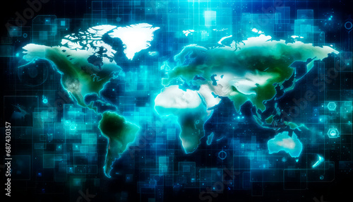 Wall mural : Abstract digital world map with blue glowing grid network lines on dark background - connectivity con