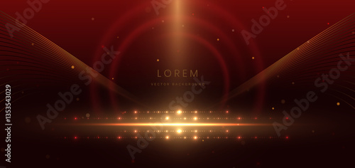 Wall mural abstract elegant gold glowing line with lighting effect sparkle on red background. template premium